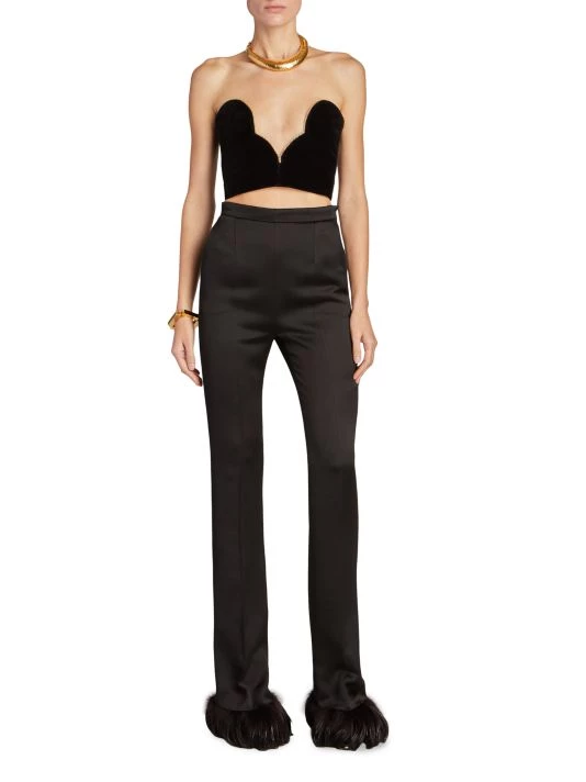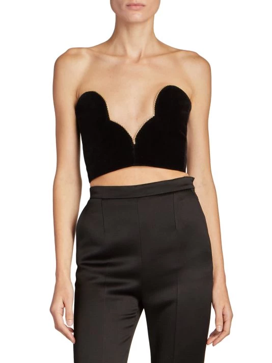 This chic velvet crop top features a unique scalloped neckline trimmed with a goldtone chain.