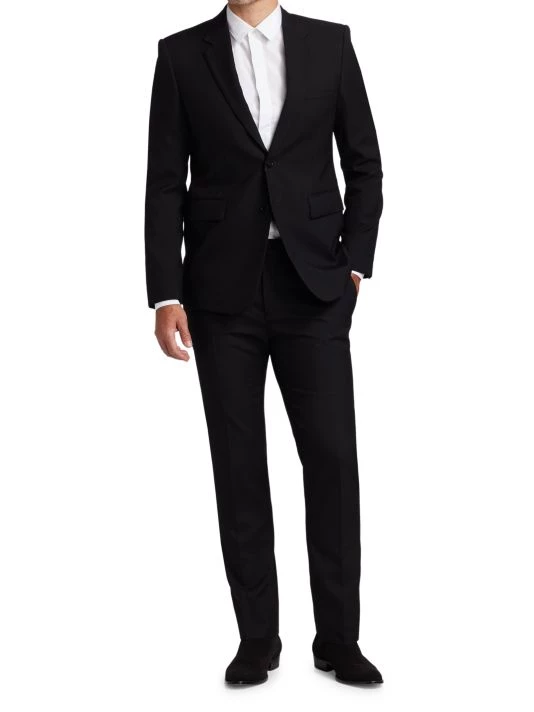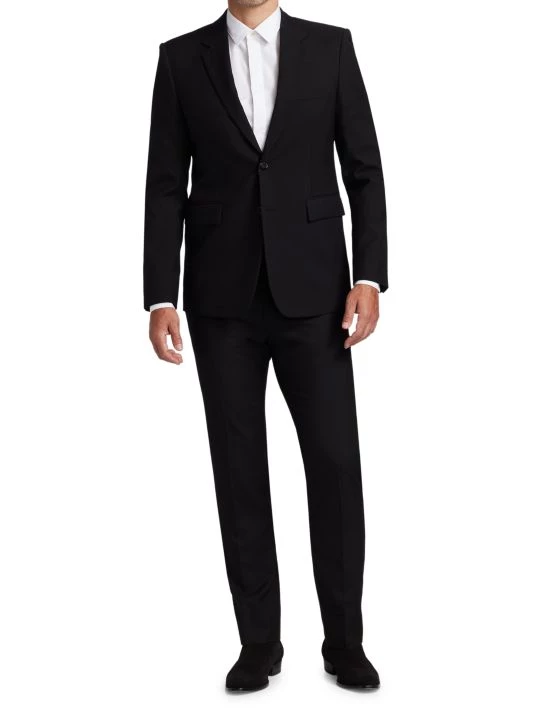 Classic two-button suit with notched lapel and flap pockets made from luxe virgin wool. Lined. Virgin wool/silk. Dry clean. Made in Italy.