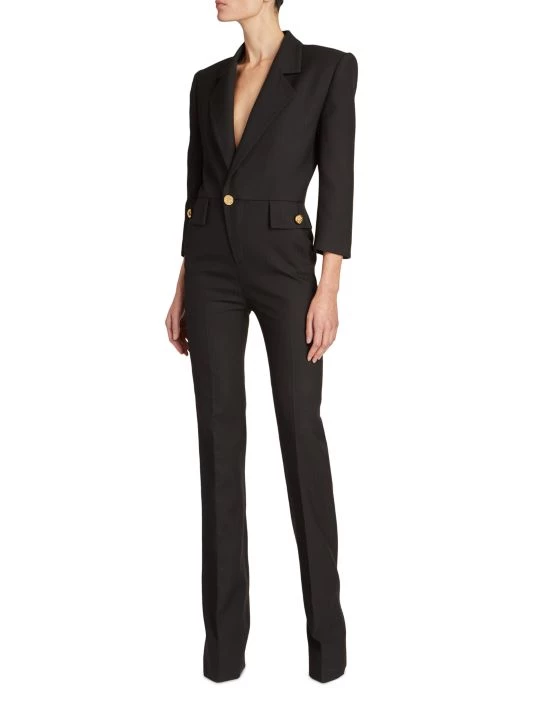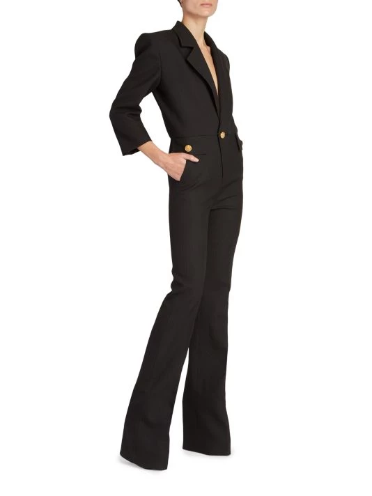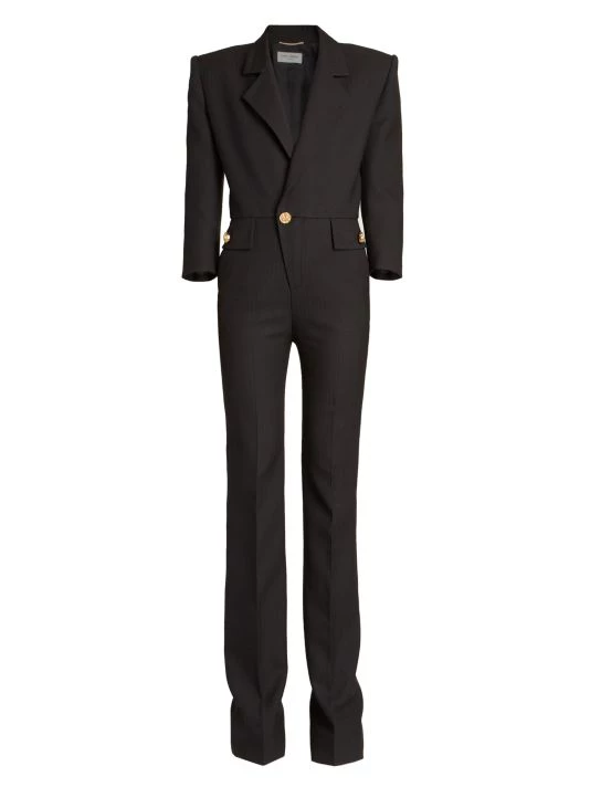 This sleek jumpsuit has notes of classic menswear styles, featuring notch lapels and single-breasted closure with a goldtone button.
