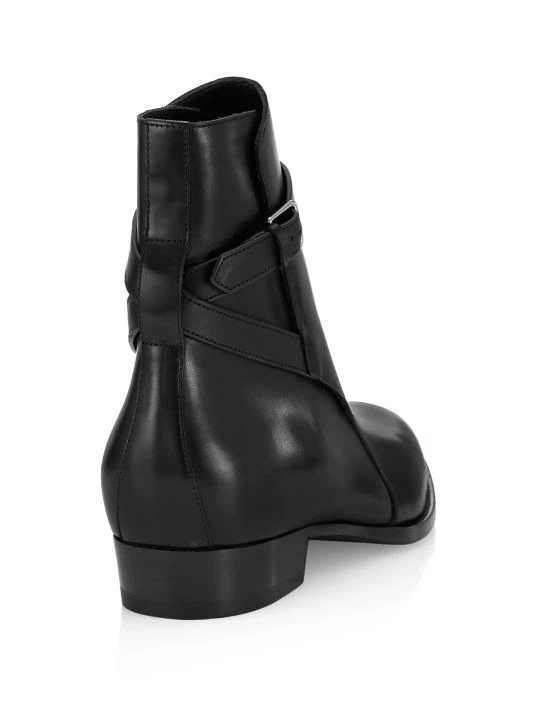 Saint Laurent introduced its famous Le Smoking tuxedo in 1966, a rendition of the classic men’s smoking suit made for women. Inspired by the iconic silhouette and 1970s women’s archival pieces, Creative Director Anthony Vaccarello reinterprets these styles for menswear with slinky, billowing shapes, delicate textures, and intricate patterns. The result is a unique, androgynous look that celebrates fluidity as a cornerstone of contemporary fashion. The Wyatt boots are a chic style crafted of smooth leather. They flaunt a wrap-around ankle strap and silvertone buckle.