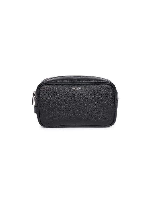 Sleek zip-top toiletry bag finished in pebbled leather.