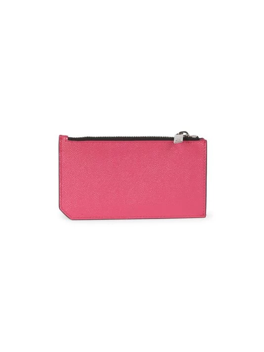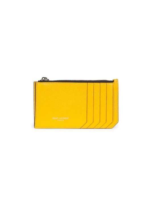 Saint Laurent introduced its famous Le Smoking tuxedo in 1966, a rendition of the classic men’s smoking suit made for women. Inspired by the iconic silhouette and 1970s women’s archival pieces, Creative Director Anthony Vaccarello reinterprets these styles for menswear with slinky, billowing shapes, delicate textures, and intricate patterns. The result is a unique, androgynous look that celebrates fluidity as a cornerstone of contemporary fashion. A stylish yet functional design, this vibrant leather cardholder flaunts a metallic foil logo, five card slots, and a zippered compartment.